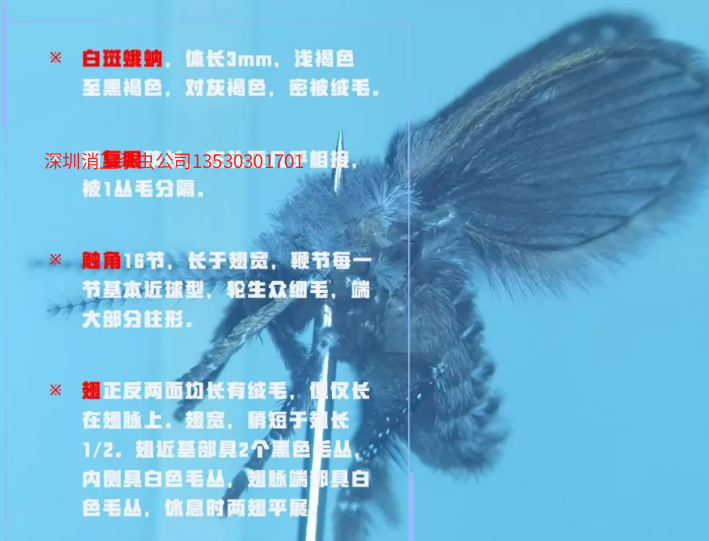 白斑蛾蚋是蛾蚋中较大个头的种类,幼虫孳生于富含有机质的浅水域中,是家居卫生间、洗浴间、窨井、化粪池常见的虫客。