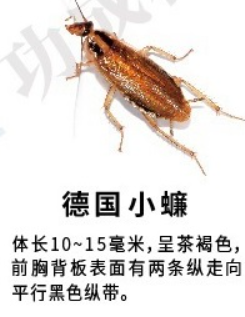 1. 德国小蠊:体型较小,是分布最广泛、也是最难治理的一类蟑螂。繁殖速度快,适应性强。